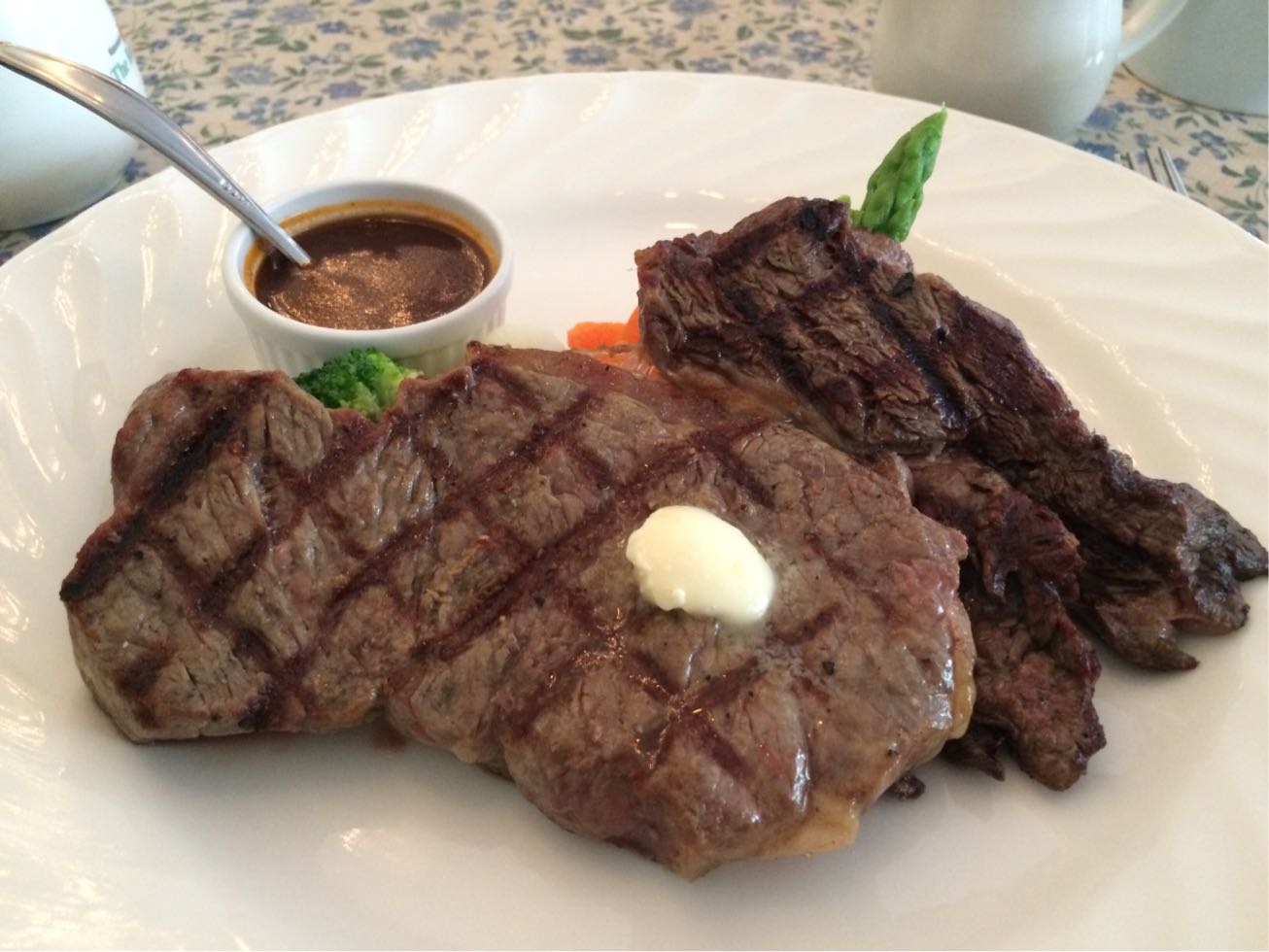 沖縄最終日今日は朝から超〜ステーキ欲求満載❗️❗️って事で朝からステーキ食べに行きました^o^日本人一組以外皆んな外国人でほぼ満席の店内^o^300gのリブ・ライス・オニオンスープ・プリン^o^ペロリと完食